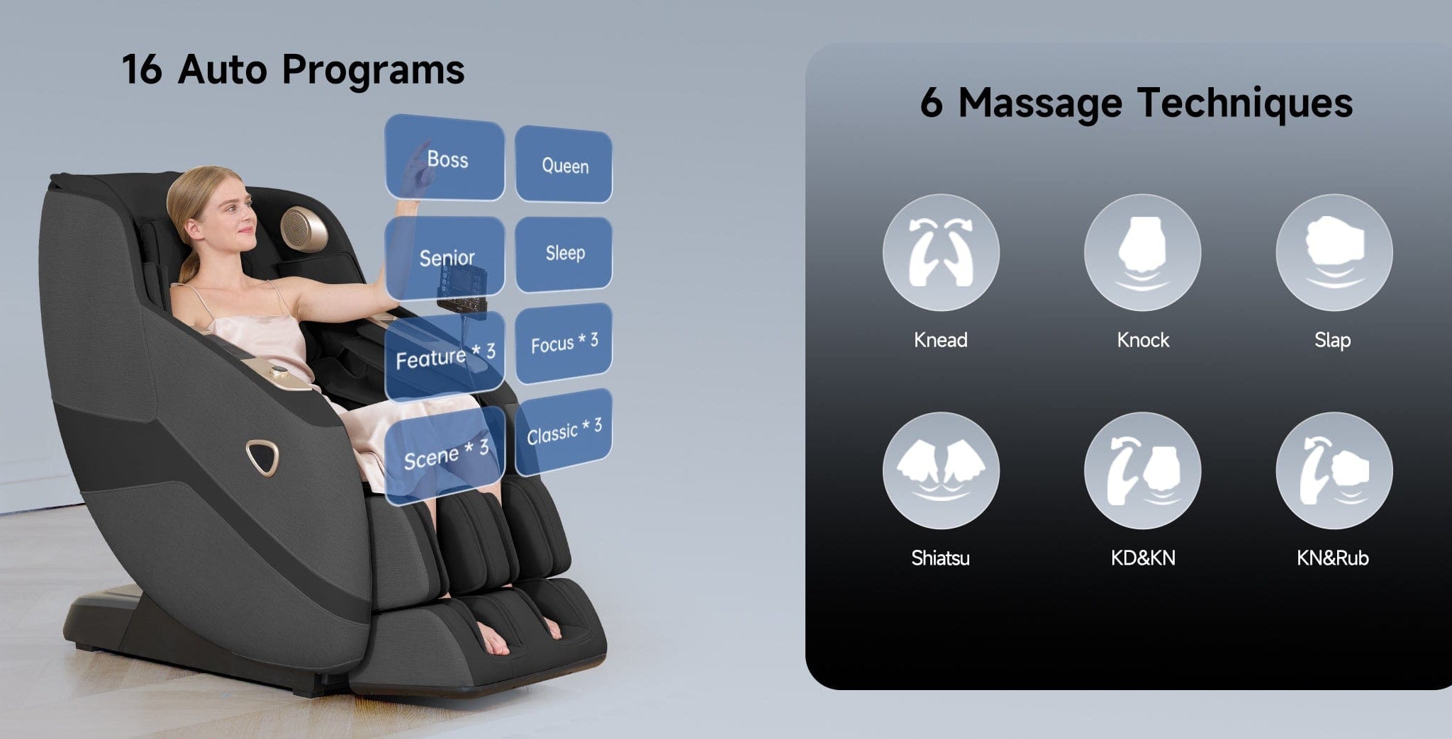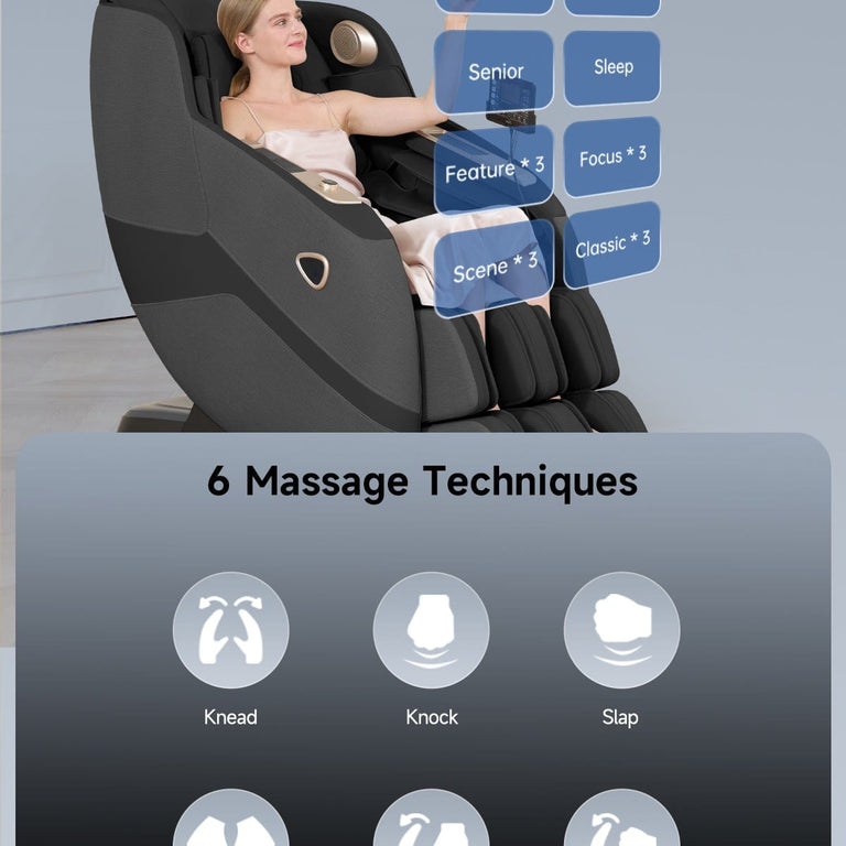 A:Equipped with an industry-leading 3D massage mechanism, it delivers a comprehensive, intelligent massage that eases tension in your shoulders, spine, lumbar region, and glutes. Its specially designed SL-Track follows your body's curves, providing a massage from neck to thighs.
