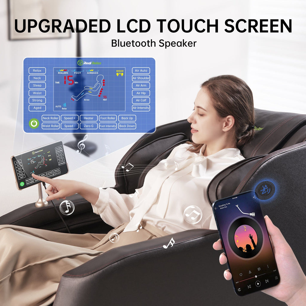 This Real Relax massage chair massage chair with 5 Auto Modes,Bluetooth Audio Play,Led Changing light,Ergonomic Design,Customize Your Precise Massage,Full Body Airbag,and Suitable Height Range. One button zero-gravity design, feel virtually weightless. 5 preset auto programs, diverse massage choices. Build in 8 massage back rollers, foot rollers massage, airbags placed over the shoulders, arms, hips, legs, calves, and feet, full body pain and tense relief. Shipped in one box, Easy to assemble.