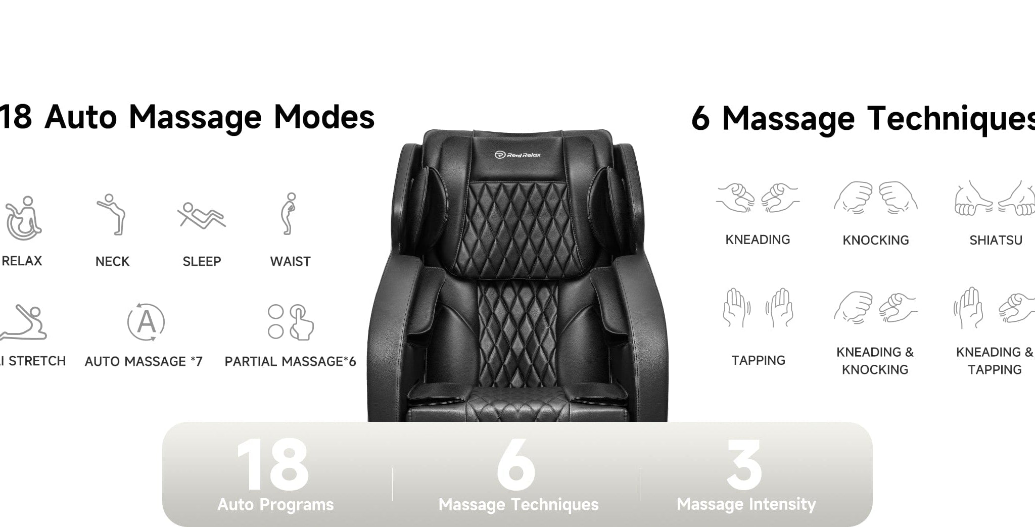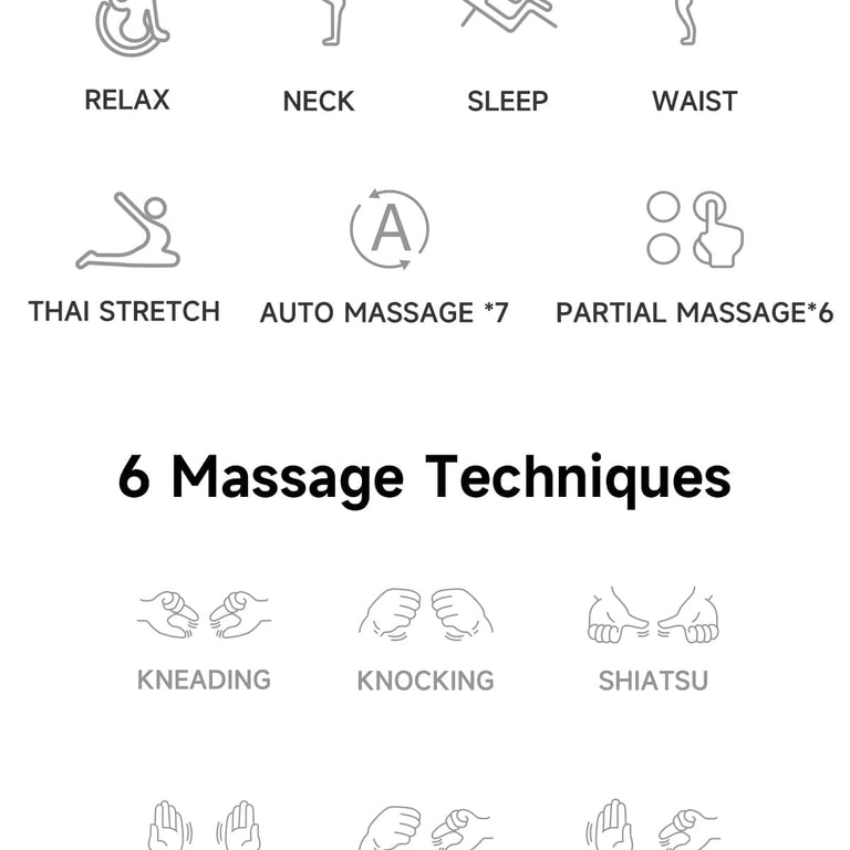 A:There are 21 auto modes: Relax, Neck, Sleep, Thai Stretch, Waist, 10 Auto Massage programs and 6 Partial Massage programs.
