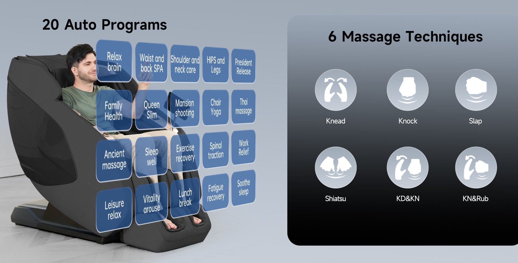 • A:There are 20 auto modes, including Relax brain, Waist and back SPA, Shoulder and neck care, Thai massage and more.