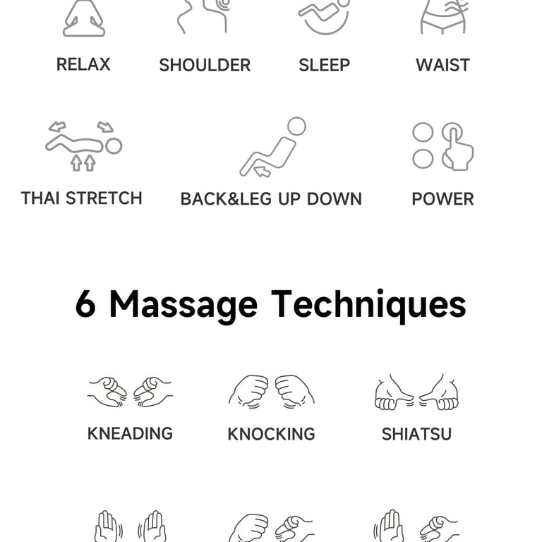 A:There are 8 auto modes: Relax, Shoulder, Sleep, Waist, Thai Stretch, Back & Leg Up Down, and Power.