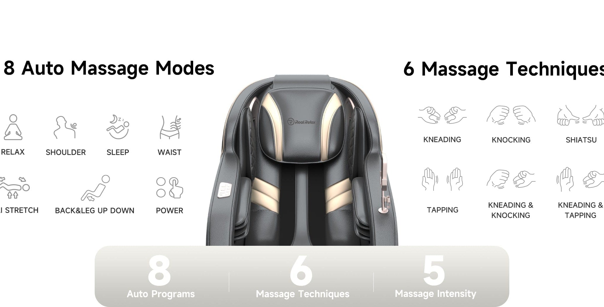 Real Relax massage chairs are equipped with full-body airbags that cover the shoulders, arms, buttocks, calves and feet, covering the entire body. Using specialized air pumps and multiple air valves, these airbags are controlled to inflate and deflate rhythmically. This full-body compression massage technique can effectively relax the body and reduce stress.